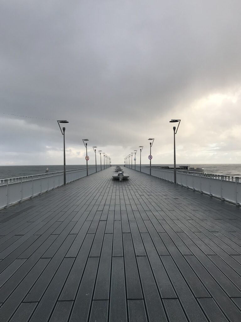 Molo Pierwszy pomost, usytuowany przy sanatorium Strandschloß (Zamek Plażowy, Pałac Nadbrzeżny) został zbudowany w 1881. Była to konstrukcja drewniana, w kształcie litery T, mająca około stu metrów długości. Na jej końcu znajdowała się przystań dla małych żaglowców. Został on zniszczony w czasie II wojny światowej.
